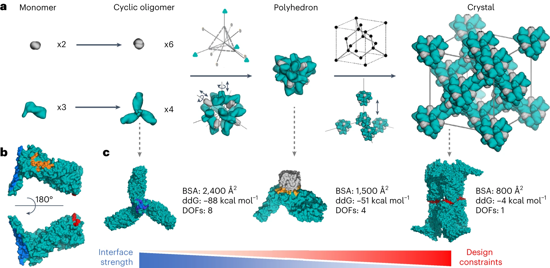 ? ? ? ?南方科技大學為論文的第一單位,生物醫學工程系李喆副教授是評述論文的第一作者和共同通訊作者。李喆副教授多年來致力于生物納米技術的研究,特別是生物大分子的晶體設計。他在博士和博士后期間分別師從DNA納米技術領域專家毛成德教授和蛋白質設計專家、美國科學院院士David Baker教授,提出了多種原創性的晶體設計思路和改造方法,包括高穩定性和動態響應性DNA三維晶體設計[4,5],以及蛋白質三維晶體的計算設計[6]。例如,在2023年Nature Materials期刊上題為“Accurate computational design of three-dimensional protein crystals”的論文中, 李喆博士、王順智博士和Una Nattermann博士提出了一種精確設計蛋白質三維晶體的通用方法。這種開創性的方法實現了原子級別精確的蛋白質晶體設計,并且在蛋白質分子的初級序列中編碼了晶體材料的自組裝信息,為結構生物學研究和生物材料工程提供了強大的平臺。