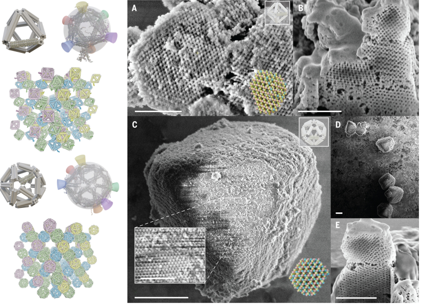 ? ? ? ?在同期Science的另一篇研究工作中,亞利桑那州立大學Petr ?ulc課題組Hao Liu等人建立了一個強大的計算實驗框架,構建基于?DNA 折紙的膠體晶體自組裝[3]。在模擬中,作者將 DNA 折紙視為表面上具有多個相互作用區域的球形顆粒,并使用反饋回路來推進有利于晶格形成的設計,并排除導致競爭性組裝的設計。經過一定次數的迭代,作者在計算機上高產率地獲得了燒綠石晶格(一種正四面體頂點相互連接的三維排列)。作者進一步在實驗中將DNA八面體以及二十面體折紙組裝成燒綠石晶格,證實了模擬結果。