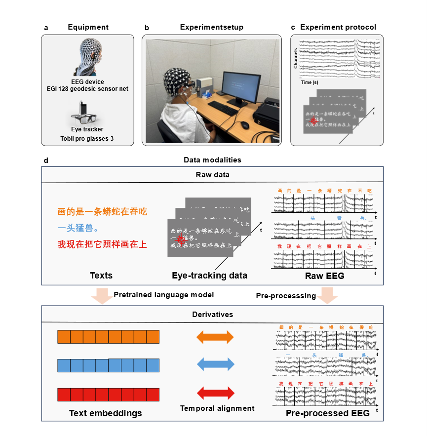 ? ? ? ? 在眾多腦影像技術中,腦電圖(Electroencephalogram,簡稱EEG)因其無創性、非侵入性、高時間分辨率以及低成本等優勢,已成為腦機接口、語義解碼等任務的熱門技術,展現出廣泛的應用潛力。目前,以外文自然語言為刺激的EEG數據集已相對完善。然而,面向大規模中文語料的腦電數據集構建仍然是一個空白領域,這一狀況嚴重制約了中文語境下大腦語言表征機制的研究,同時也限制了基于中文語境的BCI技術的準確性。
