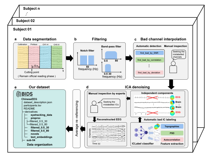 ? ? ? ? 因此,我們設計了一套針對中文閱讀任務的實驗方案,并基于這一方案構建了一個基于中文語料刺激的高通道EEG數據集ChineseEEG。圖1展示了該數據集的實驗范式和所收集的數據模態。在數據采集過程中,被試在靜默狀態下跟隨屏幕上的高亮指示閱讀中文讀物《小王子》和《狼王夢》。該數據集收集了10名被試在中文閱讀任務刺激下產生的高通道EEG數據和同步眼動數據,其中每位被試的數據記錄時間長達12小時。除了長時間的EEG記錄和眼動數據,我們還為該數據集提供了詳細的EEG預處理方案(如圖2所示),并提供了多個版本的預處理數據以供研究者使用。此外,該數據集還提供了使用預訓練語言大模型提取的閱讀刺激材料的語義嵌入,極大地便利了神經科學和自然語言處理領域的學者。該數據集已嚴格遵循腦影像數據存儲規范BIDS格式進行了整合。其詳細的結構如圖3所示。