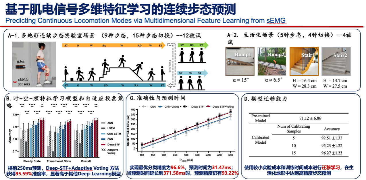 ? ? ? ?在機器人輔助的下肢運動康復訓練中,如何使外骨骼實時識別地形的變化并實現精準步態輔助?近日, 由南方科技大學生物醫學工程系張明明副教授指導的本科生與碩士生,以共同第一作者身份在國際TOP期刊IEEE Journal of Biomedical and Health Informatics發表了研究論文 “Predicting Continuous Locomotion Modes via Multidimensional Feature Learning from sEMG”。該研究提出一個針對人體步態意圖預測的算法框架,獲得了連續步態預測與生活化地形遷移能力。該論文共同第一的兩位作者(本科生、研究生)分別獲得美國馬里蘭大學帕克分校和英國愛丁堡大學的全額獎學金博士項目資助。