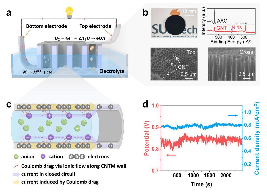 ? ? ? ?離子-電子耦合通常發生在液體和固體界面之間。通常,耦合過程可以分為三種基本類型:雙電層 (electric double layer,EDL) 電容過程;電化學氧化還原反應過程,以及贗電容過程。不同于上述被廣泛研究和應用的離子-電子耦合過程,本文提出 “離子-電子”庫倫拖拽效應,可實現離子電流和電子電流的直接交互和轉換。庫倫拖拽效應是指兩個空間相近但彼此絕緣的導電層構成了電雙層結構,在其中一層施加驅動電流會在另一層誘導產生開路電壓,即產生層間拖拽效應。“離子-電子”庫倫拖拽效應基于納米流體內離子傳輸和半導體中電子傳輸的互相作用,進而實現離子-電子的耦合過程。具體來說,在納米尺度下的離子移動行為可以誘導半導體中的自由電子移動,基于這一機制,本工作開發了一種納米流體化學發電機。如圖1所示,碳納米管膜內的納米離子流體由金屬和氧氣之間的自發氧化還原反應驅動。由于納米離子流體中離子和空穴之間巨大的質量差距(105?to 106),基于動量守恒定律,大量的自由電子在碳納米管膜中產生,進而實現了1.2 mA/cm2的放大電流。與此同時,單個納米流體化學發電機單元可以產生~0.8 V的電壓,并具有高達數十伏的線性可擴展性能。