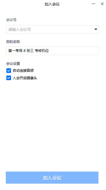 (四)加入候考室,在對話框輸入正確的名稱(第幾考場+考生序號+姓名),進入后聽從引導員引導。只進入考核主機位賬號即可,無需進入監控副機位賬號。