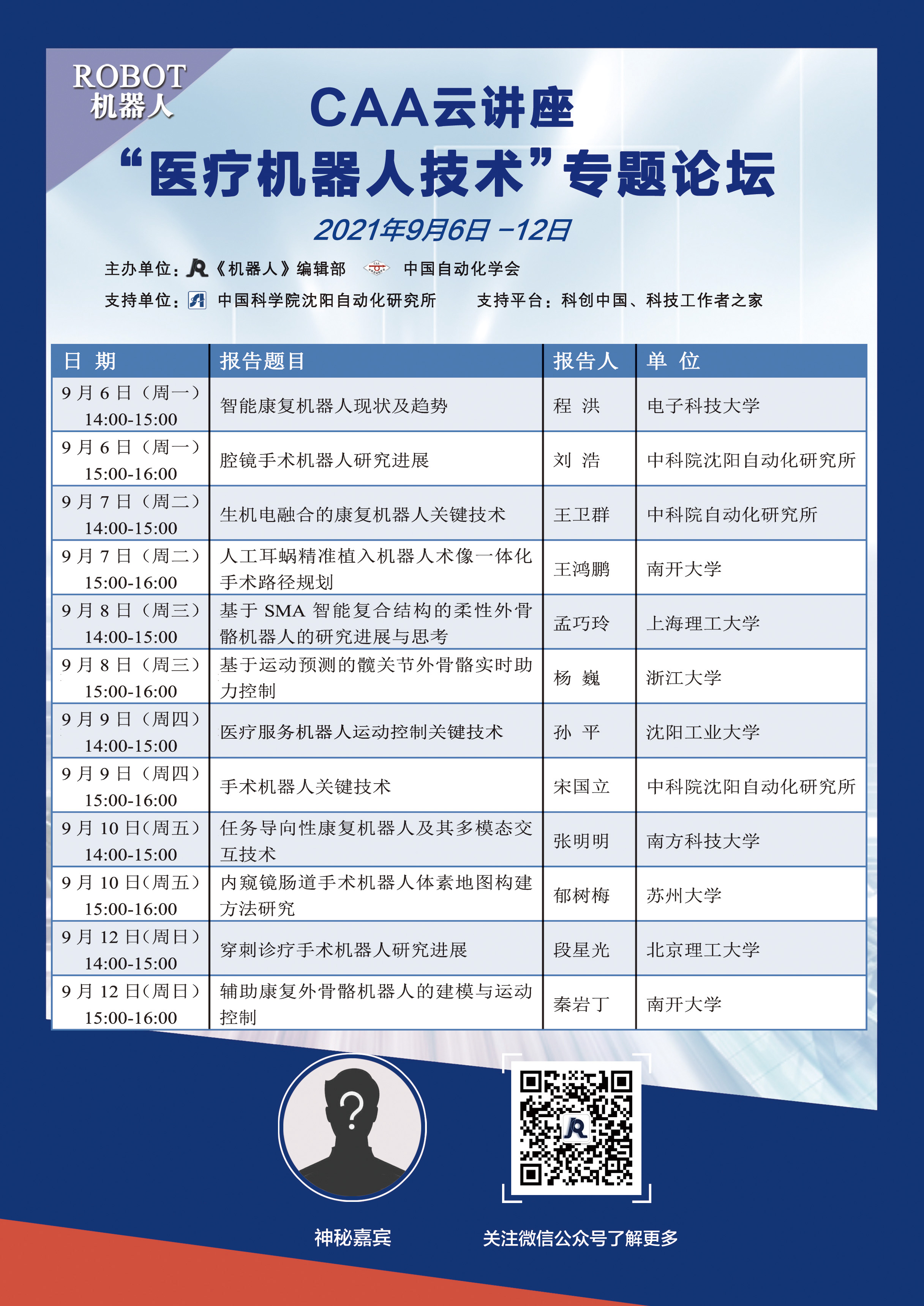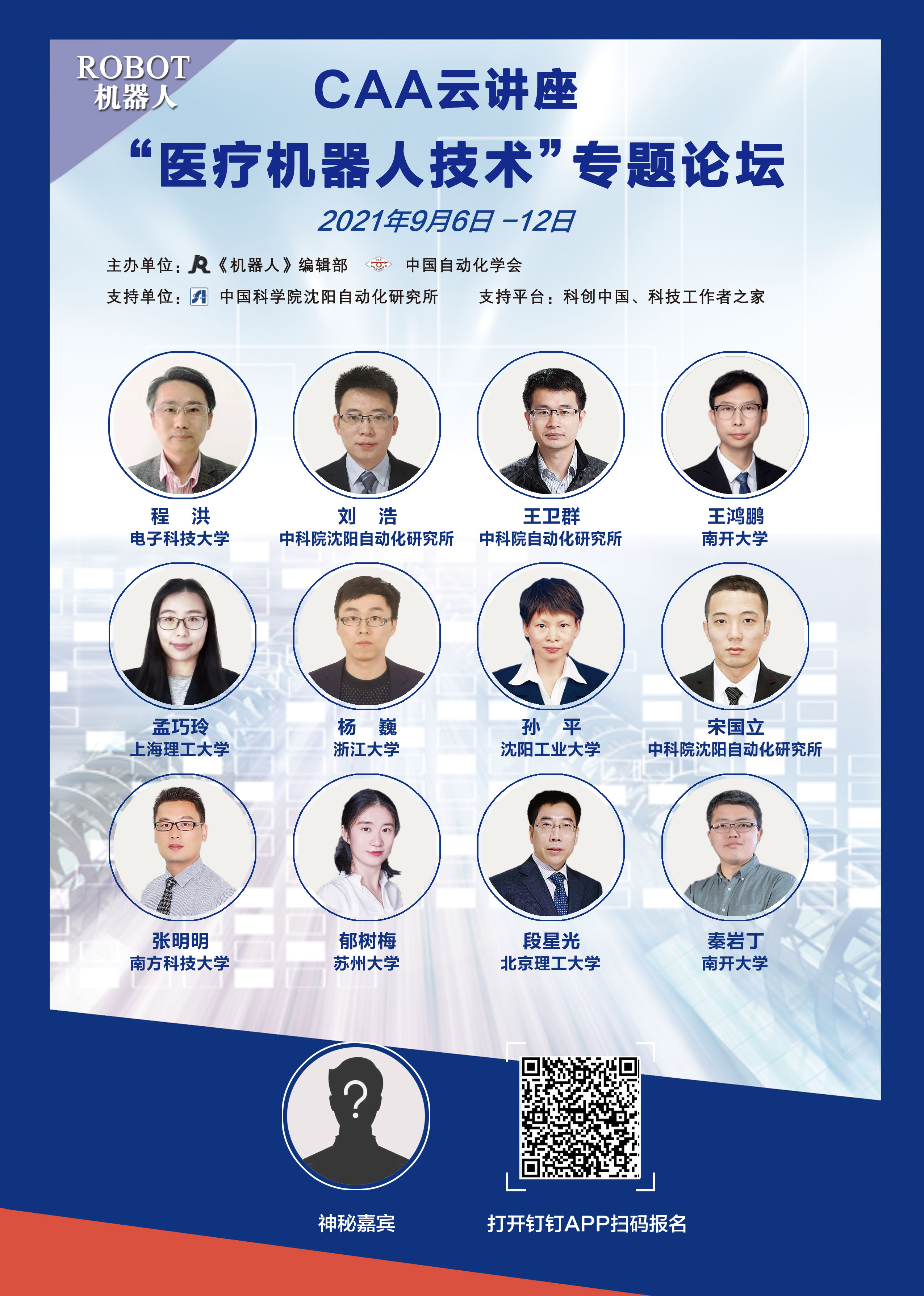 ? ? ? ? 2021年《機器人》編輯部在主辦單位中國自動化學會和中國科學院沈陽自動化研究所的大力支持下組織了“醫療機器人技術”專題在線論壇,并將于9月6日正式開播。本次專題在線論壇我們邀請了“醫療機器人技術”專刊12位發文作者作報告。
