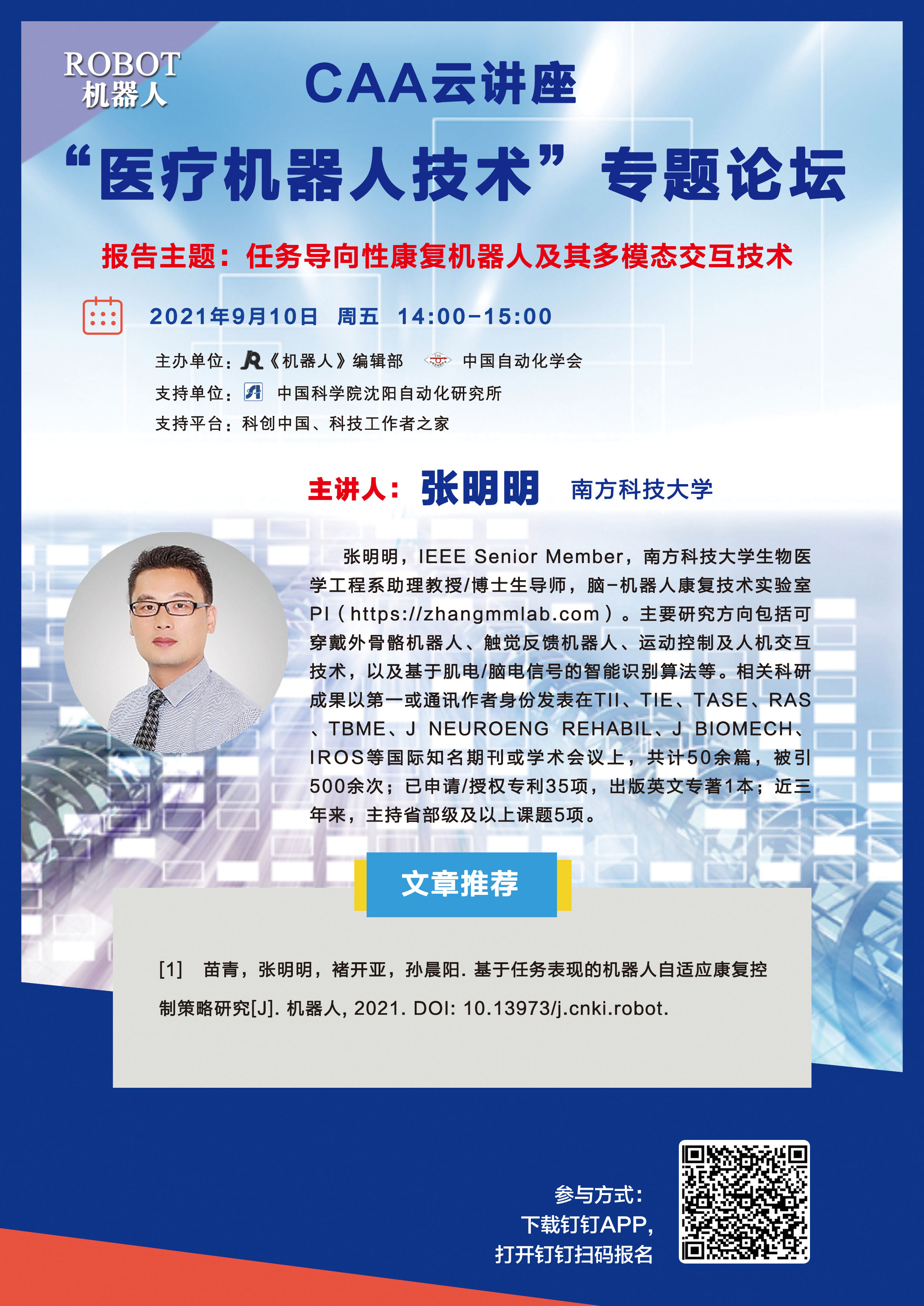 ? ? ? ? 其中,我系張明明助理教授將在9月10日(周五)14:00-15:00作報告,題目為《任務導向性康復機器人及其多模態交互技術》。歡迎廣大師生線上參加。