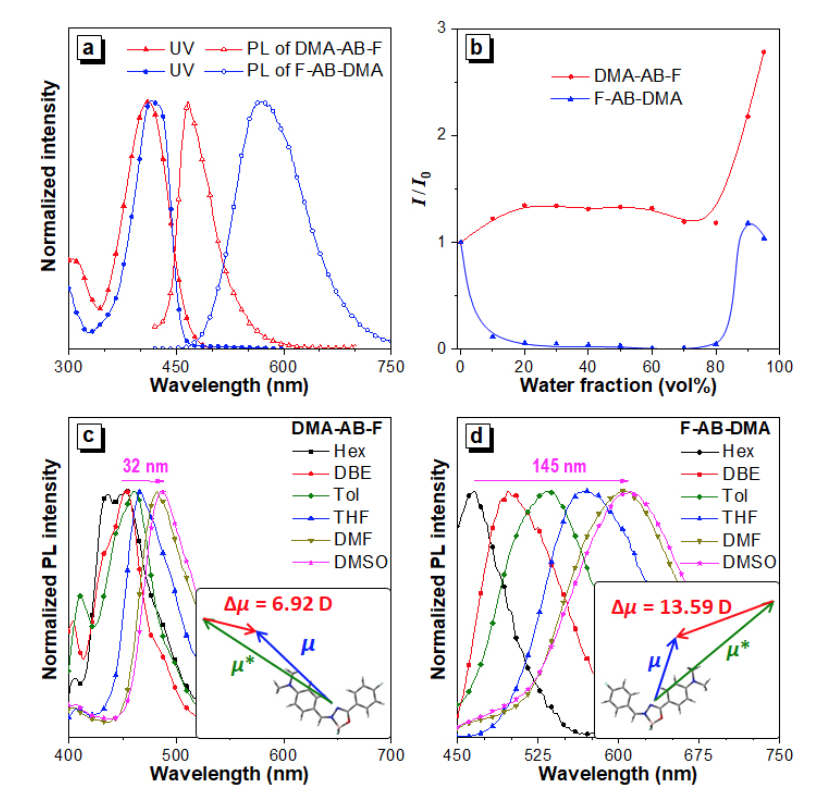 Figure 2. UV-vis and fluorescence spectra of planar AIEgens (DMA-AB-F and F-AB-DMA).