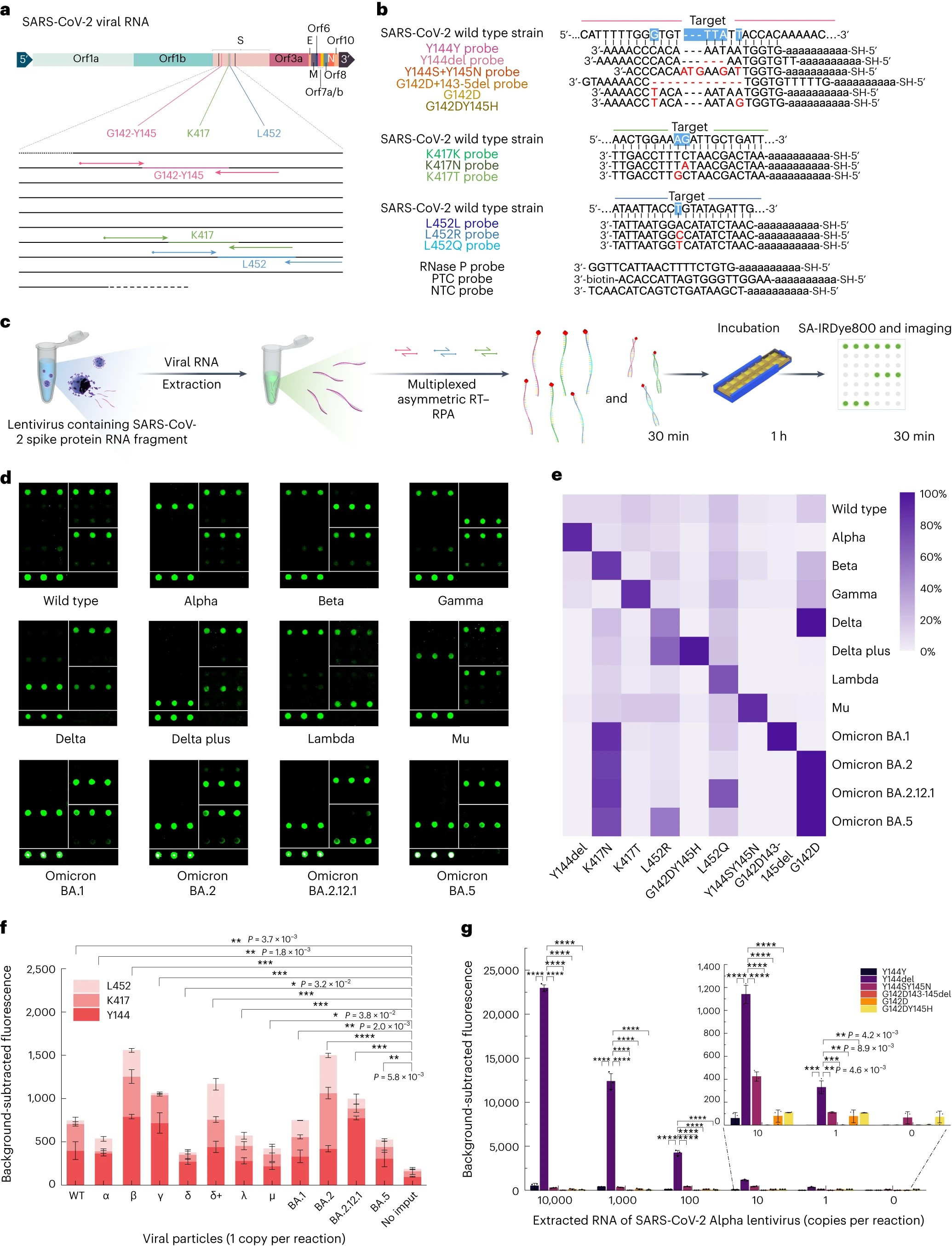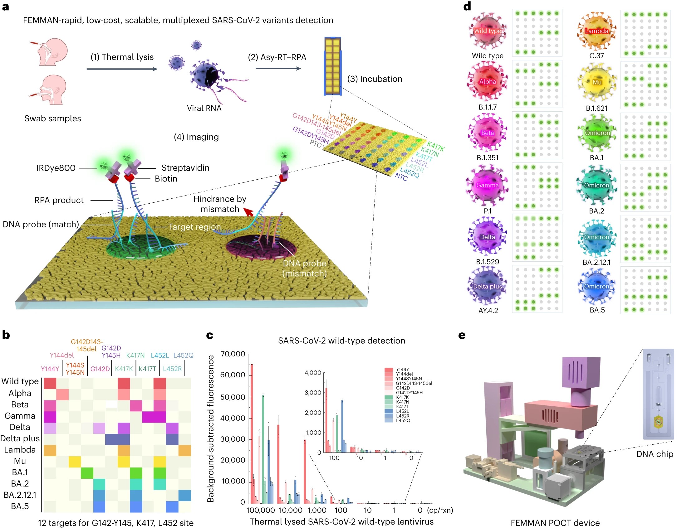 Figure 1. FEMMAN achieves single-RNA copy sensitivity with Asy-RT–RPA for the detection of SARS-CoV-2 and the simultaneous discrimination of viral variants with SNV distinction